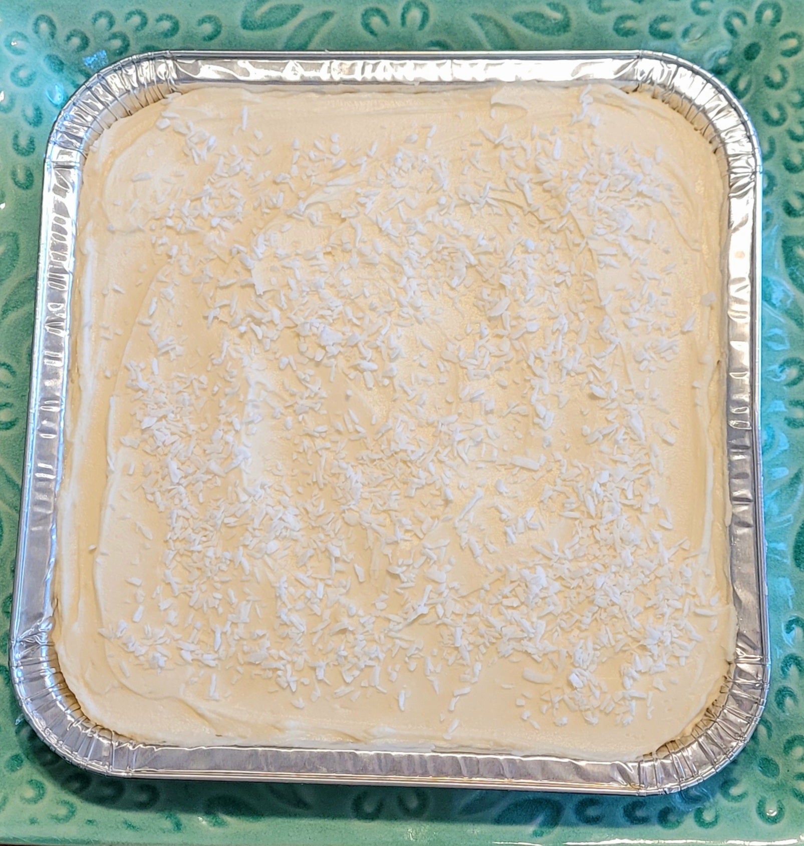 Cake: Almond flour, coconut flour, monkfruit sweetener, baking powder, baking soda, salt, unsweetened shredded coconut, eggs, heavy whipping cream, coconut oil, vanilla extract, coconut extract, unsweetened almond milk.