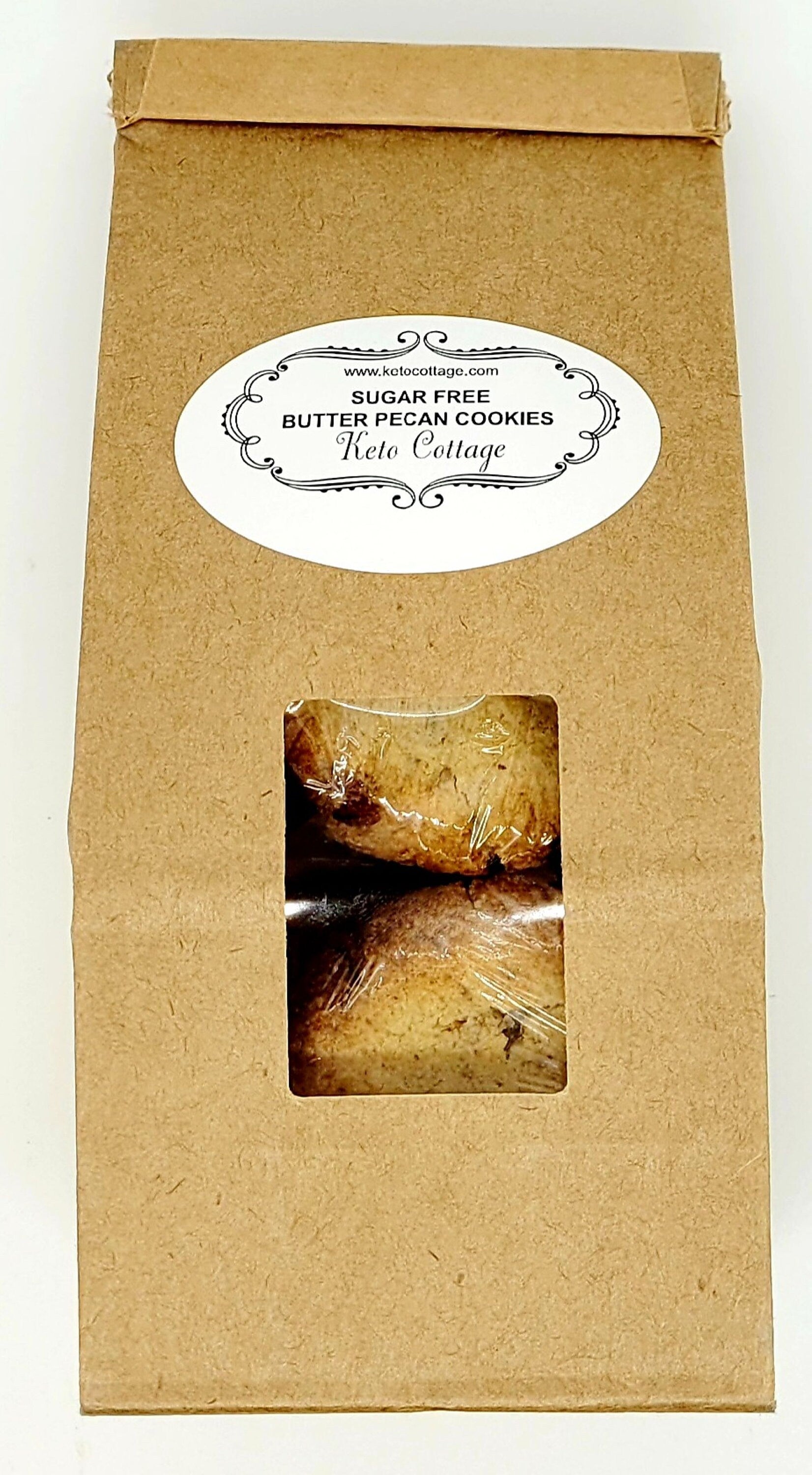 Our Keto Sugar-Free, Gluten-Free Butter Pecan Cookies taste extremely buttery and toasted pecan-flavored! Great with a cold glass of milk or sugar-free ice cream! Each batch is made to order with Almond Flour, Coconut Flour, Erythritol, Organic Stevia, Butter, Toasted Pecans, Pure Vanilla Extract, and Salt. Each cookie weighs over 1 oz. Each coffee bag has 6 cookies and is sealed for freshness. Perfect for gift giving or your special treat!